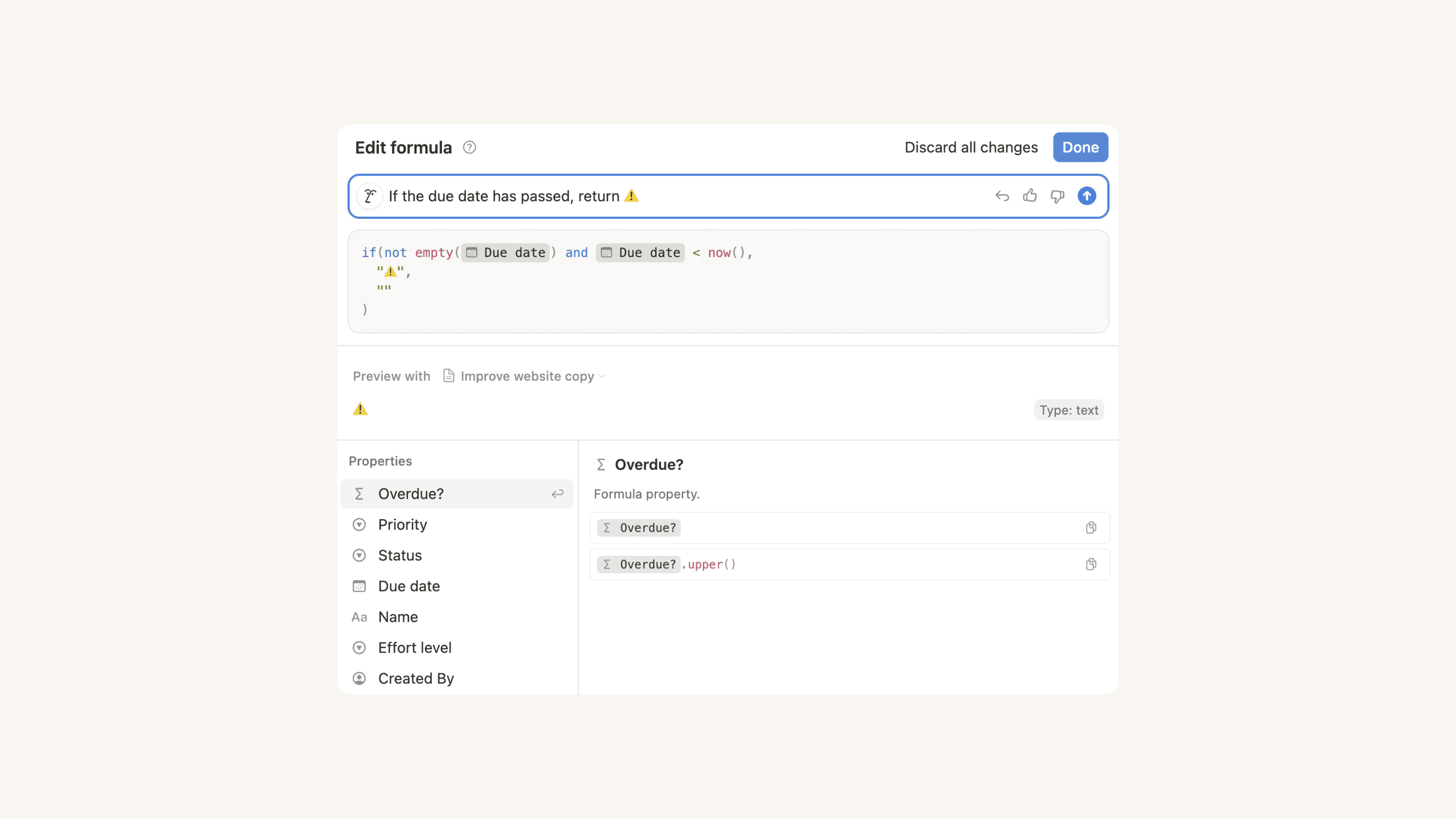 • “Make this formula handle edge cases.” (For example, Notion AI could add an if statement so that the formula doesn’t fail when a field is empty.)